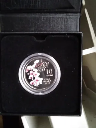 Moneda conmemorativa de San Marino para la Expo Osaka 2025. - Valor nominal de 10 euros. - Diseño con flores de cerezo y el logo de la Expo. - Presentada en su estuche original.