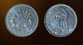 Moneda conmemorativa de la República Francesa. - Diseño detallado de la figura de Marianne. - Inscripción République Française en el borde.