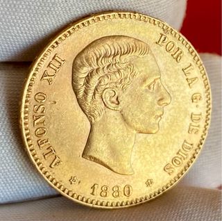 Moneda de oro de 25 Pesetas del rey Alfonso XII, acuñada en el año 1880. - Peso: 8,07 gramos. - Material: Oro. - Canto: Estriado.