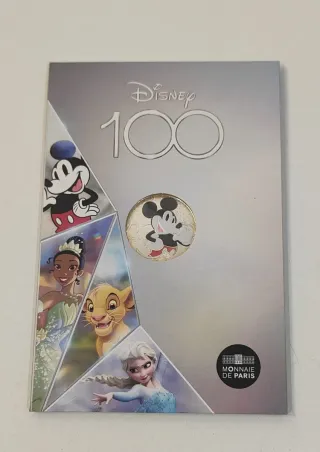 Moneda conmemorativa del 100 aniversario de Disney. - Diseño de Mickey Mouse. - Sello de la Monnaie de Paris. - Ilustraciones de personajes Disney como Tiana, Simba y Elsa.