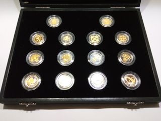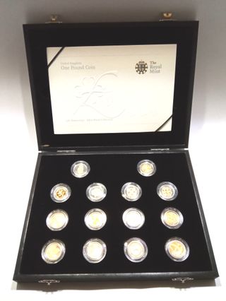 Colección en caja emitida por la Royal Mint de 14 monedas de plata 0.925 calidad proof celebrando el 25 aniversario de la moneda de libra esterlina. Con los motivos en oro de las libras aparecidasdesde 1983. Diámetro de las monedas 22,5mm, peso 9,50gr. en caja forrada de terciopelo negro y con fichas explicativas. Medidas de la caja. 25,5x20x4cm. Peso 1202gr. Sólo hago envíos.