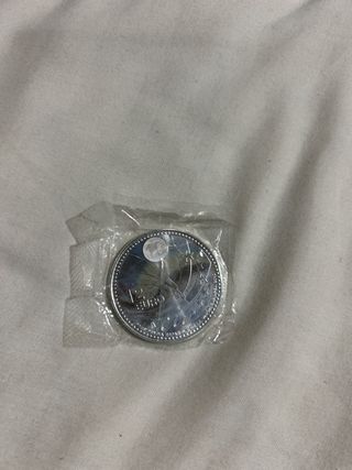 Moneda conmemorativa con diseño de rostro y texto. - Diseño de rostro estilizado. - Inscripción UT DIGITUR, VIDERE.