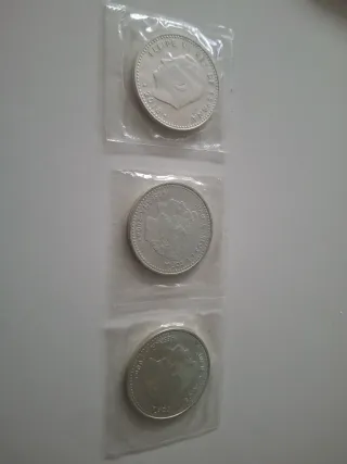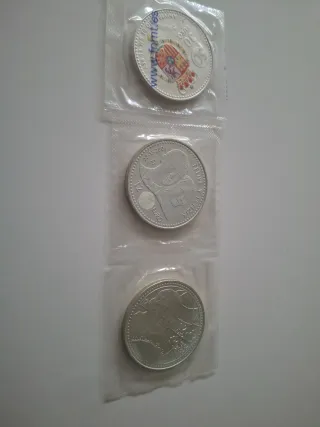 Conjunto de tres reproducciones de monedas antiguas. - Una moneda con el diseño de LEY 900 MILESIMAS 5 PESETAS PIEZAS EN KILOG. - Otra moneda con el diseño de REY CONST... DE ESPAÑA. - Una tercera moneda con el diseño de UNITED STATES OF AMERICA ONE DOLLAR.