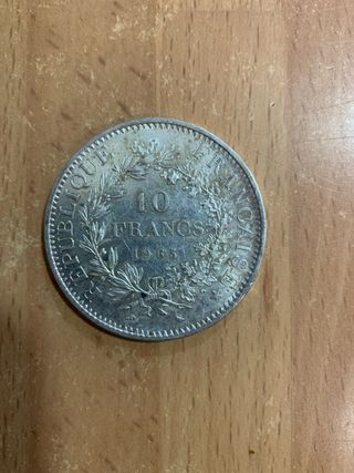 Moneda de 10 francos franceses del año 1966. Presenta un diseño con laureles y el valor nominal. - Valor: 10 Francos - Año: 1966 - País: Francia