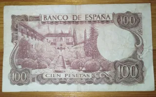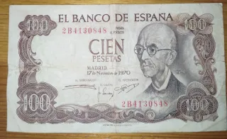 Billete de 100 pesetas del Banco de España, emitido en 1970. Presenta el retrato de Manuel de Falla. - Serie: 2B4130848 - Fecha de emisión: 17 de Noviembre de 1970 - Lugar de emisión: Madrid