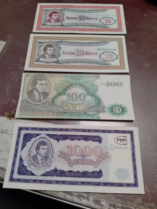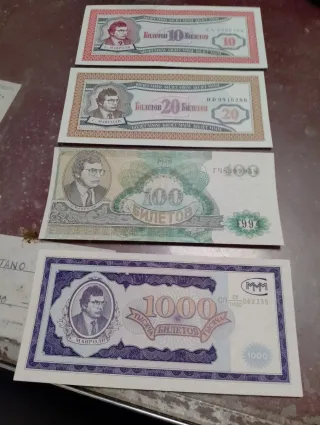 Conjunto de billetes rusos de la MMM. - Billetes de 10, 20, 100 y 1000. - Diseño con retrato de S. Mavrodi. - Año 1994 visible en uno de los billetes. Solo se podía pagar con ellos en su empresa por lo que se ven pocos los cuatro están sin circular