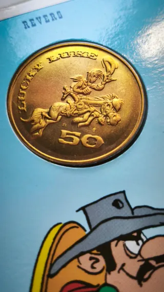 Moneda conmemorativa oficial de Lucky Luke. - Edición especial por su 50 aniversario. - Diseño inspirado en el personaje y su caballo. - Incluye el texto 1947 - 1997.