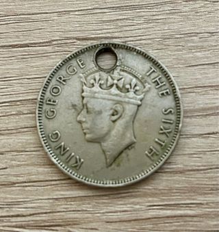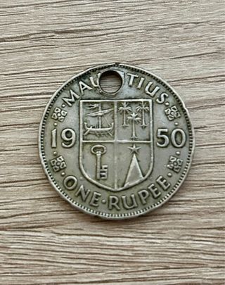 Moneda de colección: One Rupee (1 Rupia) de Mauricio, 1950. Agujero de ceca: Presenta marca de fábrica (ORIGINAL), sin modificación posterior. Estado: Circulada, desgaste moderado pero con detalles legibles (grado VF – Very Fine). Anverso: Escudo de Mauricio con leyenda “MAURITIUS”, “ONE RUPEE” y fecha “1950”. Reverso: Retrato del rey Jorge VI (George VI) con leyenda “KING GEORGE THE SIXTH”. Diámetro aprox.: ~30 mm. Metal: Cupro-níquel.