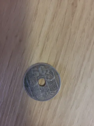 Moneda de 50 céntimos del año 1949. - Diseño con escudos. - Agujero central característico.