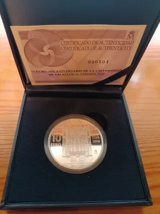 Moneda de 10€ de plata conmemorativa de los 800 años de la Universidad de Salamanca. Incluye certificado. - Diseño: Universidad de Salamanca. - Valor: 10 Euros. - Material: Plata. - Edición: Proof. - Conmemoración: 800 años (1218-2018). - Fabricante: Real Casa de la Moneda.