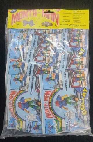 Paquete o blíster de ocho sobres Monta-Man nuevos y precintados, de figuras de plástico muy populares en los años 70 y 80. También se comercializaron como Montaplex. No leer: Yo fui a EGB, Retro, Vintage, juguete,