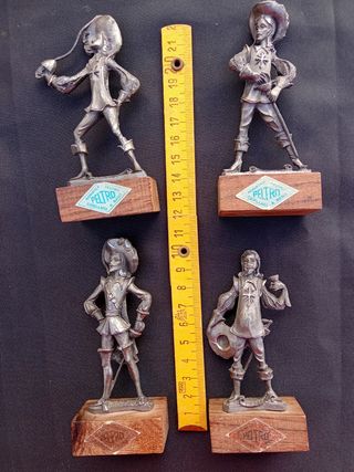 4 figuras de estaño que representan a D'Artagnan y los tres mosqueteros. dimensiones de cada una altura 10,2 cm longitud 4,6 cm ancho 2,7 cm peso 76 gramos Sobre base de madera. 649895577 Alymer, Montaplex, Chouve, Reamsa, Comansi, Fontanini, Tamiya, Ferrer Dalmau, Alborox, Renault 7, Jecsan, Muñecas Antonio Juan, Bandai, Bernat, Bizak, Epoch para Imaginar, Famobil, Famosa , Orgullo Gay, Giochi Preziosi, Hasbro, Geyper, Lego, Exín Castillos, Geyperman, Madelman, Fisher Price, Little people, Pinocho, Papo, Plastoy, Schleich, Ronda 101 Km,