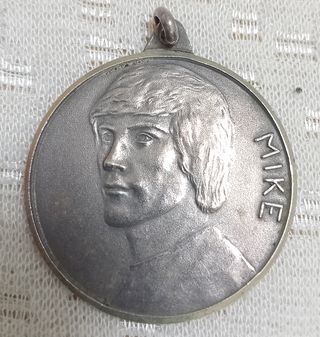 Medalla del cantante Mike Kennedy. Mide tre cms de dia metro.Regalo con ella hebilla de cinturon con su imagen, no esta en buen estado