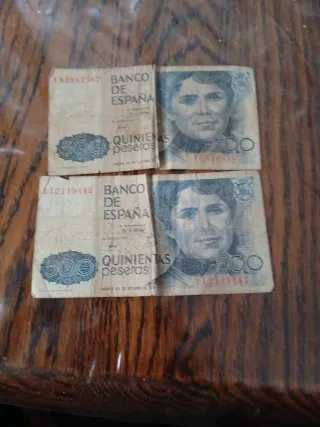 Se venden dos billetes antiguos de 500 pesetas del Banco de España. Escucho ofertas - Billetes de colección. - Serie 112119142 y 180952387. - Valor nominal: 500 pesetas cada uno.