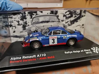 Réplica del Alpine Renault A110 que compitió en el Rallye Neige et Glace de 1972. - Modelo a escala del coche de rally.1/43 - Decoración de Bernard Darniche y Alain Mahé. - Incluye base expositora con el nombre del evento y año.