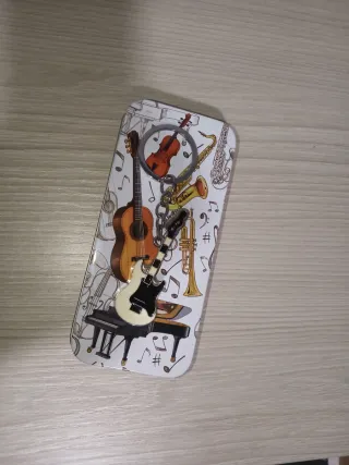 Llavero con diseño de guitarra eléctrica en blanco y negro. - Incluye cadena y anilla. - Presentado en una caja metálica con motivos musicales.