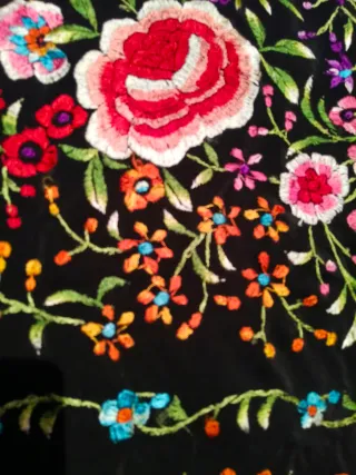 Elegante mantón de Manila con un intrincado bordado floral sobre fondo negro. - Diseño de flores multicolores. - Bordado detallado en hilo. - Base de terciopelo negro.