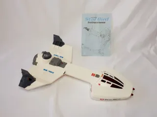 Nave espacial electrónica Star Bird de la marca MB. Fabricada entre finales de los 70 y principios de los 80. Con sonido de motores que cambia según la inclinación. Luces y sonido de rayos láser que se activan pulsando el botón superior. Todo probado y funcionando. De las pocas en venta que conserva el cañón de la torreta giratoria. Siempre se ha guardado sin pila, por lo que el conector está impecable y no se ha sulfatado. Incluye los dos interceptores de las alas, manual de instrucciones y garantía. No leer: juguetes, vintage, arma, 70's, 80's.