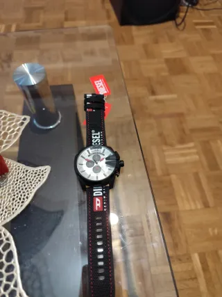 Reloj de pulsera de la marca Diesel, modelo Mega Chief. Presenta un diseño llamativo y moderno. - Correa de tela negra con detalles en rojo. - Esfera con múltiples subesferas.