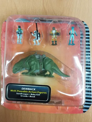 Blíster sellado y cartón recortado del Battle pack #4 de Star Wars de Action Fleet de micromachines Galoob, de 1996. Incluye: Dewback, Sandtrooper, Boba Fett, Bossk, Greedo