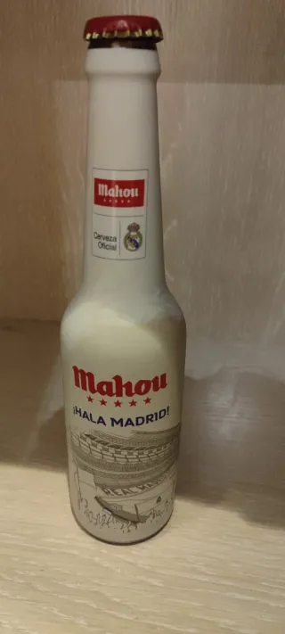 Botellín de cerveza Mahou conmemorativo del Real Madrid. - Diseño especial Hala Madrid!. - Incluye escudo del Real Madrid y Cerveza Oficial. - Ilustración del estadio Santiago Bernabéu.