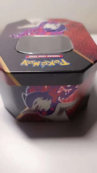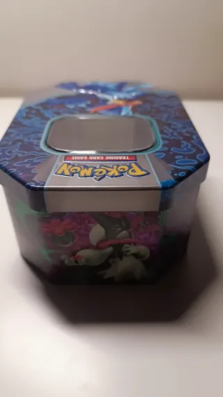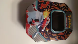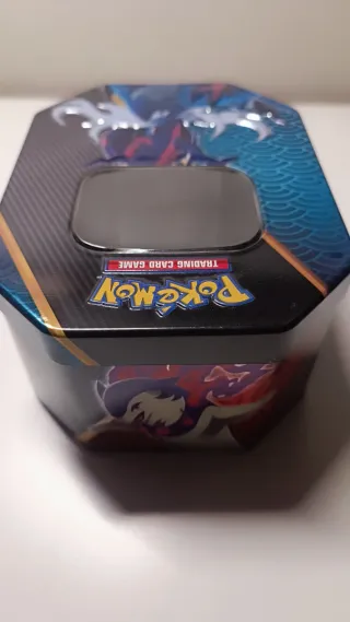 Lata coleccionable de Pokémon Koraidon ex Trading Card Game. Ideal para guardar tus cartas o como objeto decorativo. - Diseño octogonal con ventana. - Ilustración de Pokémon en relieve. - Material metálico resistente.