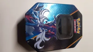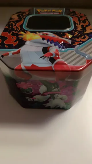 Lata coleccionable de Pokémon con diseño de Miraidon EX. - Lata metálica grande. - Diseño de Miraidon EX. - Vacía, ideal para guardar cartas o coleccionables. MAS LATAS EN MI PERFIL
