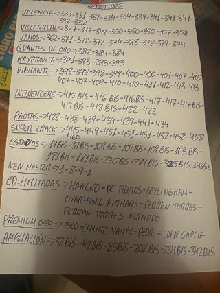 Dame tu lista y los miramos sin compromiso. *Básicas,escudos y estadios 0'15. Jugadores top 0'30 *Vamos y guantes oro 0'30 *Kriptonita,Diamantes,influencer y protas 0'40 *Super crack y New máster 0'60. *Difíciles:59,89,90,194,201,263,265 y 275 0'80. *Vamos: 375 y 377 1€ Kryp,diamante, protas: 392,401,408,437. 1'50€ *Super crack:443,444 2€ Influencer bis 1€ Balón oro excelente Carvajal 6€ Pedido mínimo 3€ +1'50 carta y envío. Anuncios personalizados por wallapop. No tengo más especiales,ni ediciones limitadas ni firmas.
