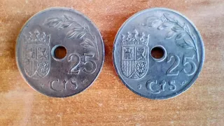 Se venden lote de dos monedas de 25 céntimos de peseta acuñadas en 1937, durante la Guerra Civil Española. - Estado: Muy buena conservación, relieves bien definidos (ver fotos). - Material: Cuproniquel. -Detalles: Incluyen el iconico agujero central, el escudo con rama de olivo y el símbolo del yugo y las flechas en el reverso. - Inscripción: "II Año Triunfal ".
