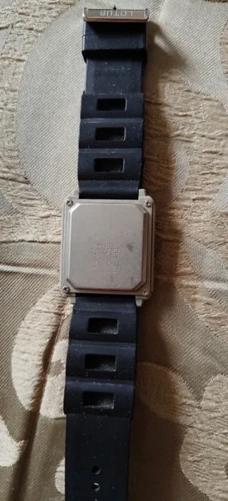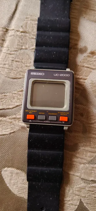 Reloj de pulsera digital Seiko UC-2000. Presenta un diseño cuadrado con correa negra. - Pantalla digital. - Botones de control: Split/Reset, Mode, Transmit, Start/Stop, Scroll, Select. - Correa de caucho negra.