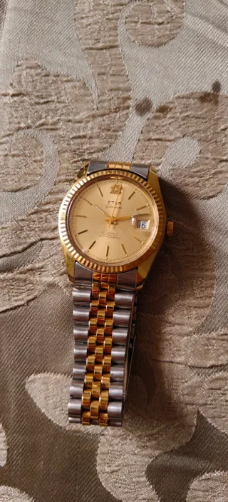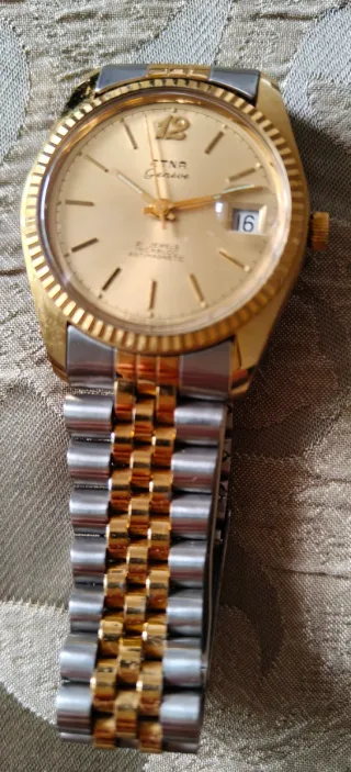 Reloj de pulsera Etna Geneve con movimiento automático y esfera dorada. - Bisel estriado. - Correa de acero inoxidable y oro. - Ventana de fecha. - 21 Jewels. - Antichoque y antimagnético.