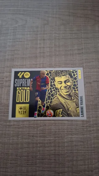 Colecciona este cromo de Lamine Yamal de la colección Supreme Extra Gold. - Diseño con detalles dorados. - Ilustración de Lamine Yamal. - Incluye logo de Panini.