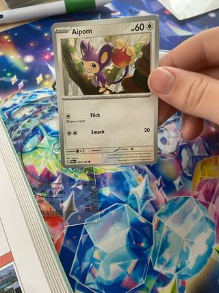 Carta Pokémon de Aipom, número 145/182. - Ataques: Filch y Smack. - Debilidad x2. - Resistencia. - Retirada.