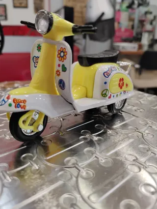 Preciosa moto a escala con un diseño divertido y colorido. - Decoración con motivos de paz, flores y corazones. - Colores principales: amarillo y blanco. - Ideal como objeto decorativo.