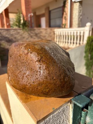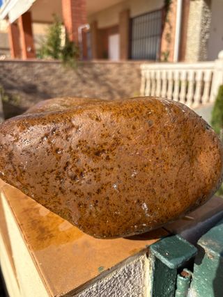Esta piedra tiene un color marrón rojizo con motas oscuras y un acabado brillante, ideal para decoración. - Textura rugosa con pequeñas cavidades. - Forma ovalada y aplanada.