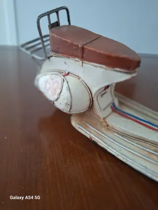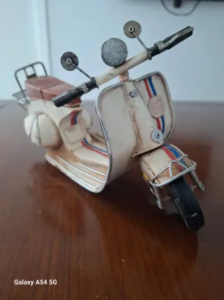 Réplica de moto clásica, ideal para coleccionistas o como elemento decorativo. - Diseño estilo Vespa. - Acabado en color crema con detalles en rojo y azul. - Número '69' en el frontal. - Incluye portaequipajes trasero.
