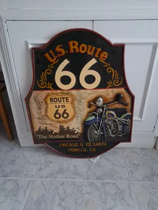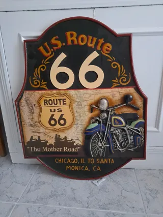Este cuadro decorativo con diseño retro de la Ruta 66 es perfecto para dar un toque vintage a tu espacio. Incluye una representación de una motocicleta clásica y el mapa de la ruta.mide de alto 60cm y de ancho 48cm - Diseño de la U.S. Route 66. - Imagen de motocicleta y mapa. - Texto The Mother Road y Chicago, IL to Santa Monica, CA.