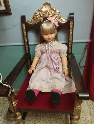 Conjunto de muñeca clásica y sillón de época. - Muñeca con vestido rosa y detalles de encaje. - Sillón de madera oscura con detalles dorados y asiento de terciopelo rojo. - Ideal para coleccionistas o decoración.
