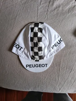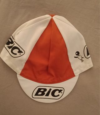 Lote de cinco gorras de equipos ciclistas de las décadas de 1970 y 1980. - Gorra BIC naranja y blanca. - Gorra KAS blanca con franja amarilla y azul. - Gorra Reynolds azul con detalles de coronas. - Gorra blanca con franjas azules y rojas. - Gorra Peugeot con patrón de cuadros.