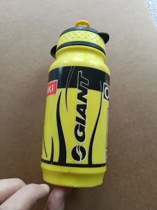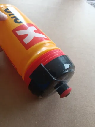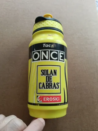 Bidón de agua del equipo ONCE de 1995. Un objeto de coleccionismo para aficionados al ciclismo. - Color amarillo. - Diseño con el logo ONCE y figura de ciclista.