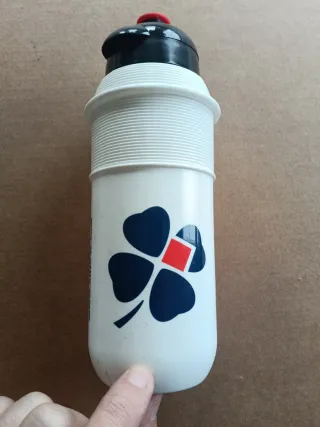 Bidón de equipo FDJ del año 2015. Presenta un diseño con un trébol azul y un cuadrado rojo en el centro. - Color blanco. - Tapa negra y roja.