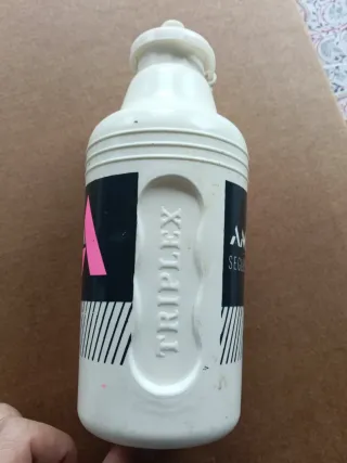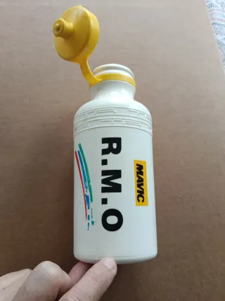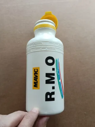 Bidón de agua vintage del equipo RMO de 1987. Un objeto de colección para los amantes del ciclismo. - Color blanco con detalles de colores. - Tapa amarilla. - Logo de Mavic.