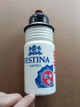 Bidón del equipo Festina de 1993. Un artículo de colección para los aficionados. - Diseño blanco con logo de Festina. - Incluye imagen de un reloj Festina.