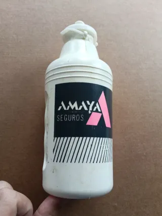 Bidón de equipo de Amaya Seguros del año 1993. Presenta un diseño distintivo con el logo de la marca. - Color blanco. - Etiqueta negra con logo rosa y líneas blancas.