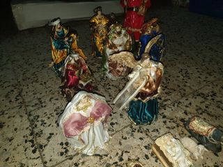Conjunto de figuras para Belén y Reyes Magos. - Figuras detalladas con vestimentas coloridas. - Incluye un cordero blanco. - Representación de escenas navideñas.