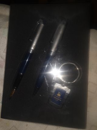 Set de escritura y accesorio con el logo del Colegio Urdaneta. - Bolígrafo azul con detalles plateados. - Otro bolígrafo plateado. - Llavero con etiqueta azul del colegio.