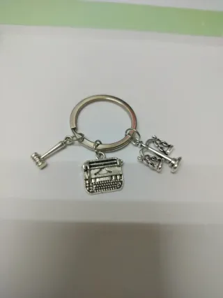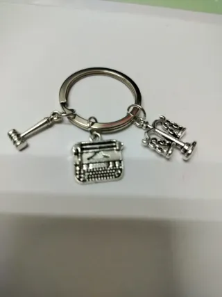 Llavero con tres dijes: un martillo de juez, una máquina de escribir antigua y una balanza de la justicia. Ideal para profesionales del derecho o amantes de la escritura. - Dijes de metal plateado. - Incluye anilla para llaves.