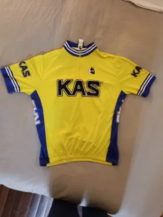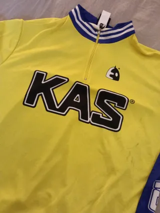 Maillot de ciclismo del equipo KAS de 1986, una edición limitada de Etxeondo. Presenta el icónico diseño amarillo y azul. - Diseño clásico del equipo KAS. - Logo del equipo en el pecho y mangas. - Cuello alto con cremallera.
