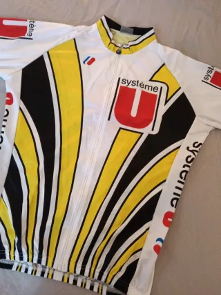 Maillot de ciclismo vintage Système U de 1987, una edición limitada para coleccionistas. - Diseño icónico con rayas amarillas, negras y blancas. - Logotipo de Système U prominentemente visible. - Cremallera frontal completa.