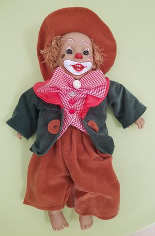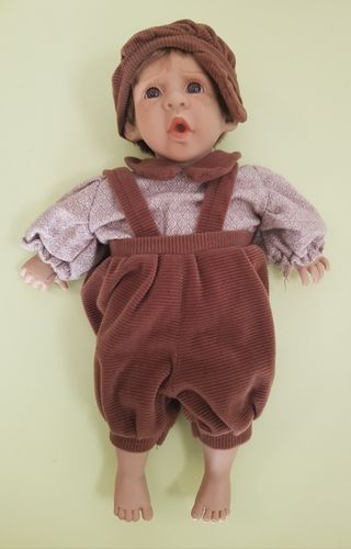 Preciosa muñeca de porcelana vestida con un traje de lunares y detalles amarillos. - Vestido de lunares con volantes amarillos y encaje. - Pantalones blancos satinados. - Sombrero a juego con cinta.